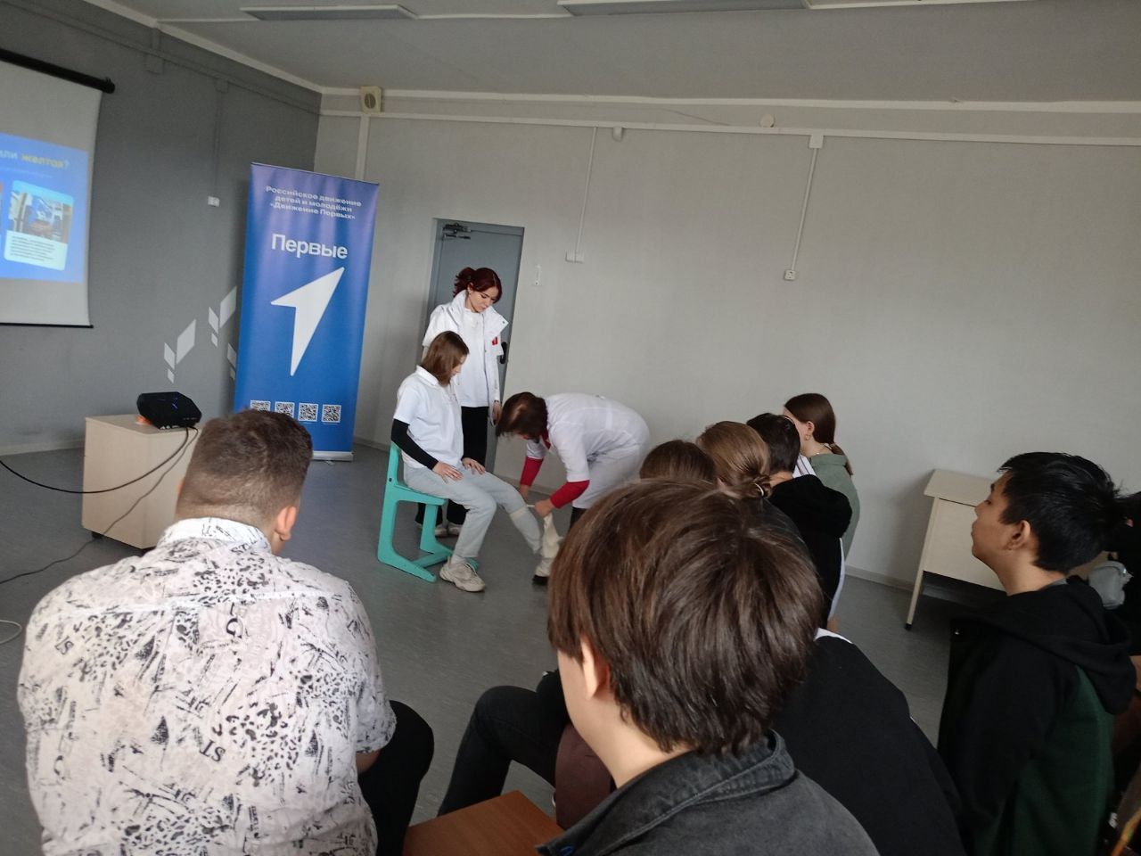 В рамках реализации Всероссийского проекта "Первая помощь" для учащихся 9 "А" класса прошёл урок первой помощи. Ребята не только узнали много нового и интересного о том, как оказывать первую помощь и вести себя в опасных ситуациях, но и смогли поучаствовать в интересных конкурсах. Медсестра Татьяна Васильева Попова наглядно показала, как правильно делать сердечно-лёгочную реанимацию,накладывать шину при переломе, остановить артериальное и венозное кровотечение.