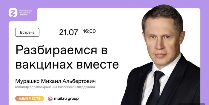 Прямой эфир с министром проведет российское общество «Знание» при поддержке акции #МыВместе. Задать вопрос можно на сайте: vk.cc/c48eSUЭто первая онлайн-встреча проекта «Разберемся в вакцинах вместе». Он призван помочь принять решение по прививке, развеять мифы, дать четкую инструкцию по порядку вакцинирования в регионах.