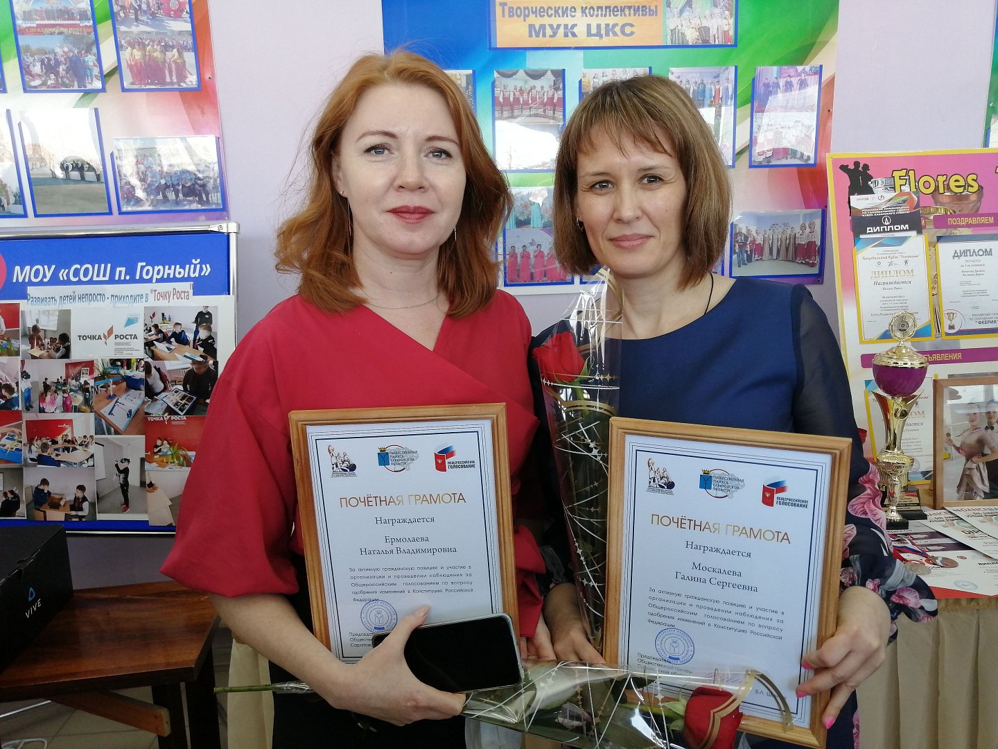 Почетными грамотами Общественного Совета РФ и Саратовской области награждены Гилева Эльвира Петровна, зам.директора по учебно-воспитательной работе Краснопартизанского политехнического лицея, Ермолаева Наталья Владимировна (на нижнем фото слева), педагог дополнительного образования МУДО «РДДТ р.п. Горный», Лаврикова Елена Александровна, и.о.заведующего д.с. «Малыш», Москалева Галина Сергеевна (на нижнем фото справа), методист МУДО «РДДТ р.п. Горный».