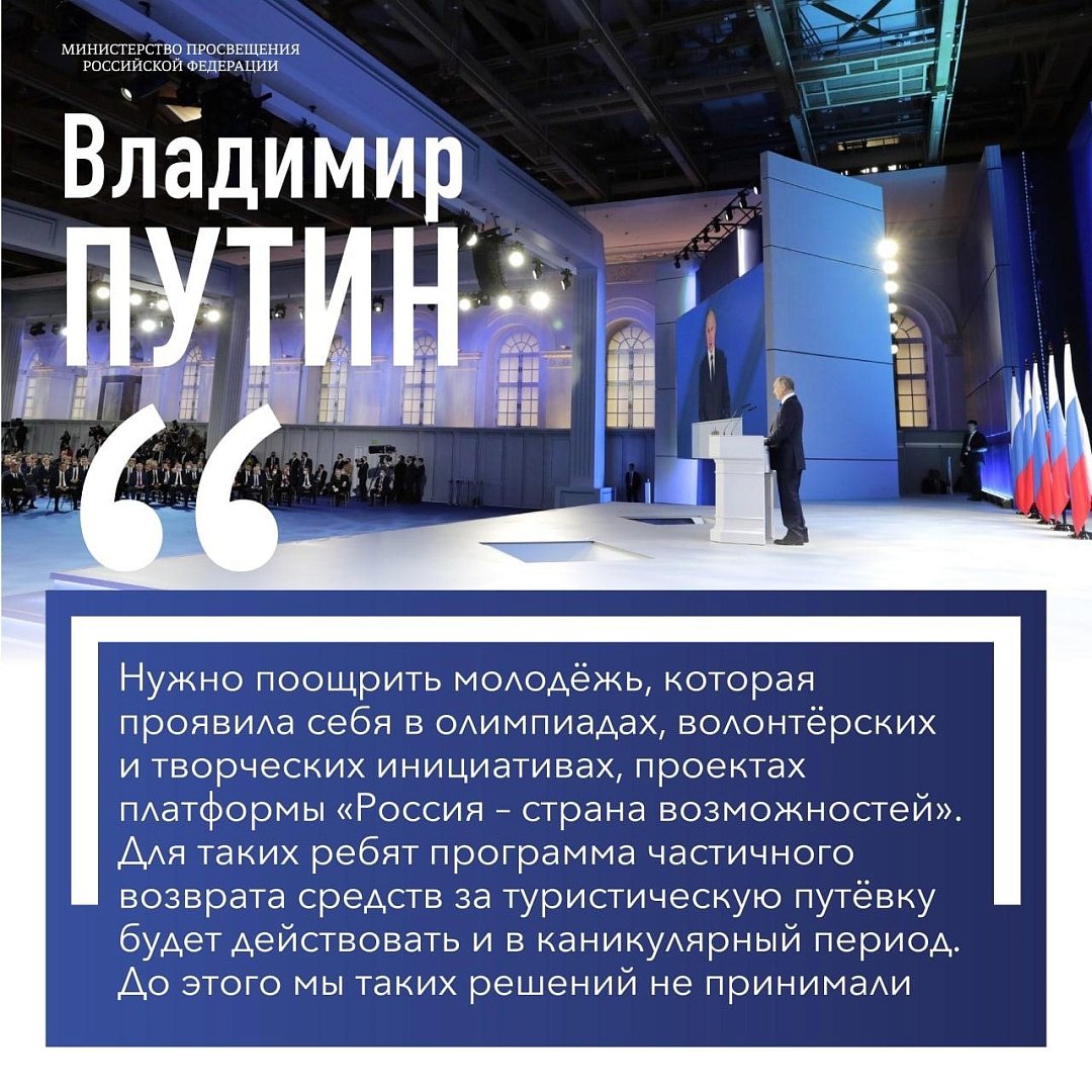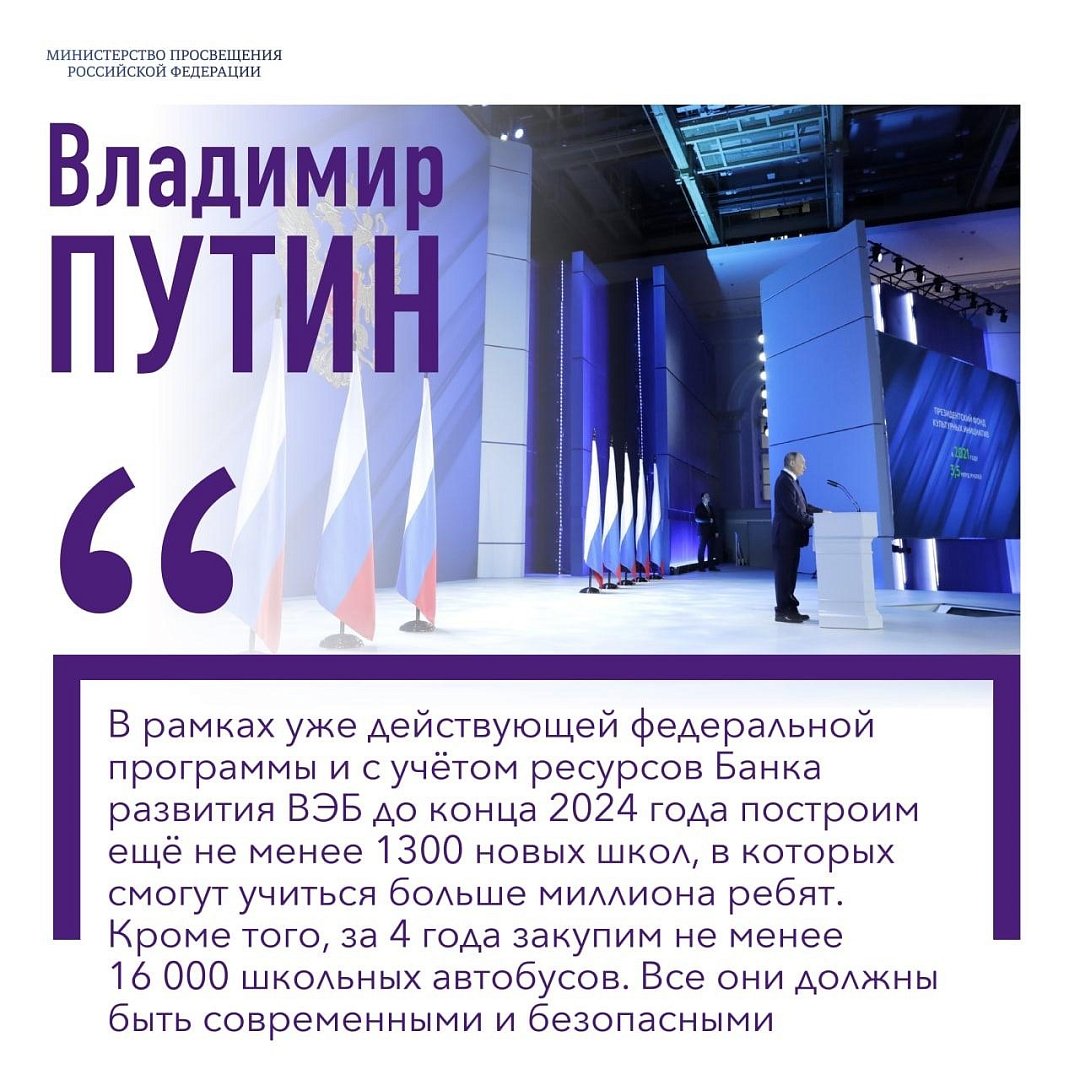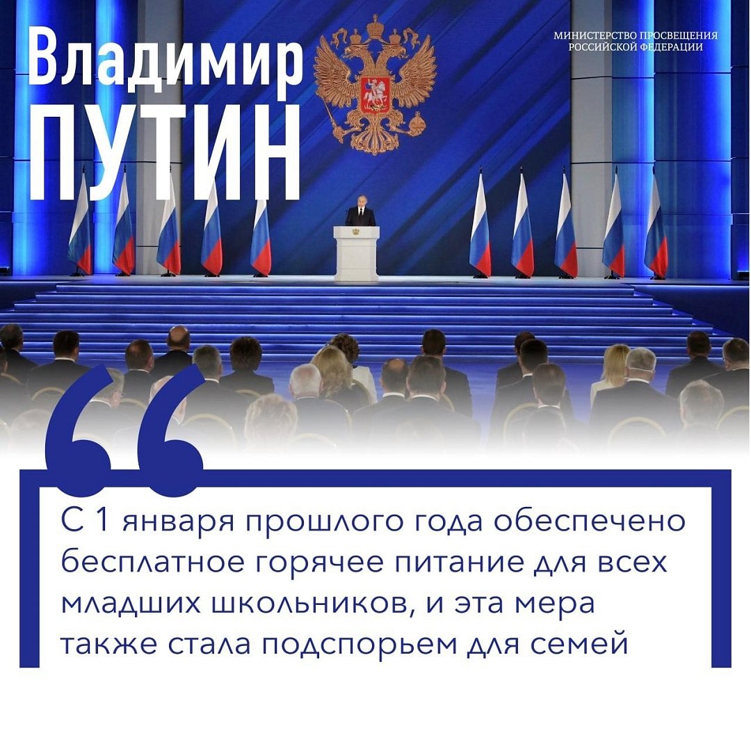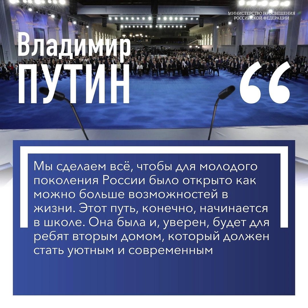 О строительстве новых школ, обеспечении учащихся младших классов бесплатным горячим питанием, создании возможностей для развития детей и поддержки молодых талантов говорил Владимир Путин, выступая с ежегодным Посланием Федеральному Собранию.