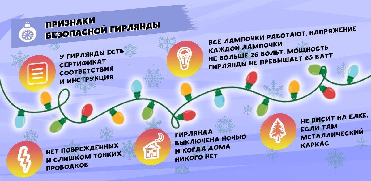 Новогодняя ёлочная гирлянда считается безопасной, если: приобретена только с сертификатом соответствия; при её покупке, внимательно изучена информация на упаковке (инструкция по применению); тщательно проверена её целостность и работоспособность до того, как ей украсят ёлку; электрический провод без повреждений, все лампочки на ней горят, а штекер в розетке не должен искрить и греться. При обнаружении неисправности, электрогирлянда должна быть немедленно обесточена.