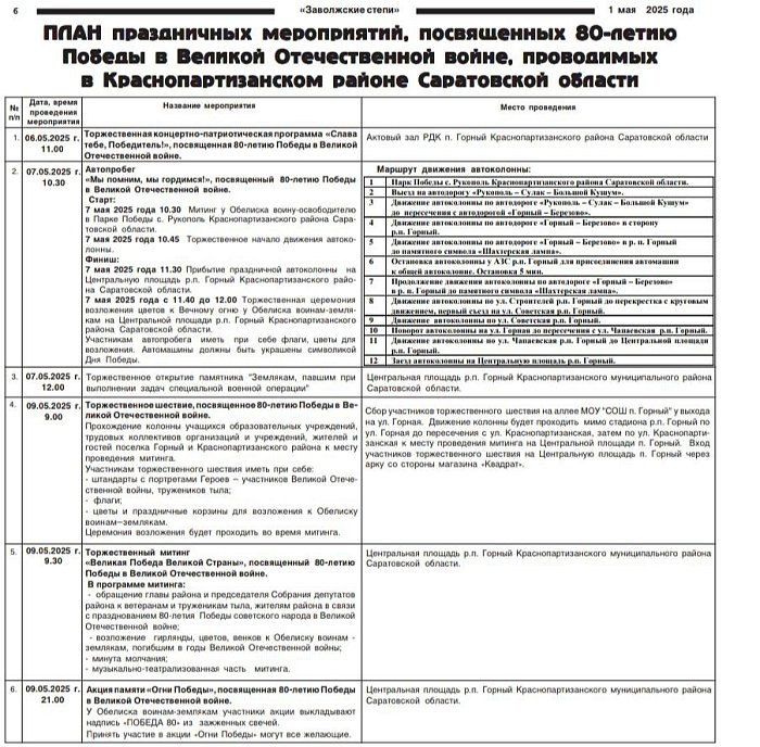 Для вашего удобства публикуем ПЛАН праздничных мероприятий, посвященных 80-летию Победы в Великой Отечественной войне, проводимых в Краснопартизанском районе.