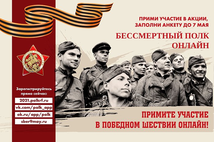 До 7 мая 2021 года подайте заявку на сайте проекта «Бессмертный полк» 2021.polkrf.ru/, через социальные сети ВК vk.com/polk_app и Одноклассники ok.ru/app/polk или на сайте «Банк памяти» sber9may.ru/, чтобы фотографии ваших ветеранов были включены в трансляцию, и они приняли участие в виртуальном шествии «Бессмертного полка».