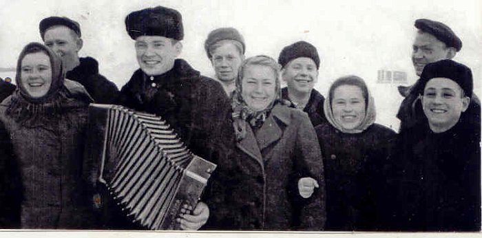 На фото (архив) Н. П. Гаврилов (с гармошкой) и комсомольцы с. Еменец. 1952 г.