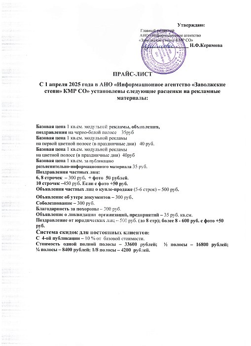 Стоимость рекламных материалов, опубликованных на страницах газеты "Заволжские степи"