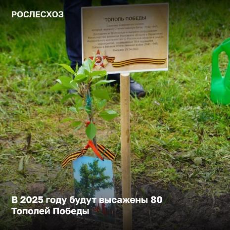 В 2025 году в России планируется высадить (https://rosleshoz.gov.ru/news/federal/rosleskhoz-v-2025-godu-budut-vysazheny-80-topoley-pobedy-/) более 27 млн деревьев в рамках Международной акции «Сад памяти». Особое внимание будет уделено Тополю Победы.Про Тополь Победы