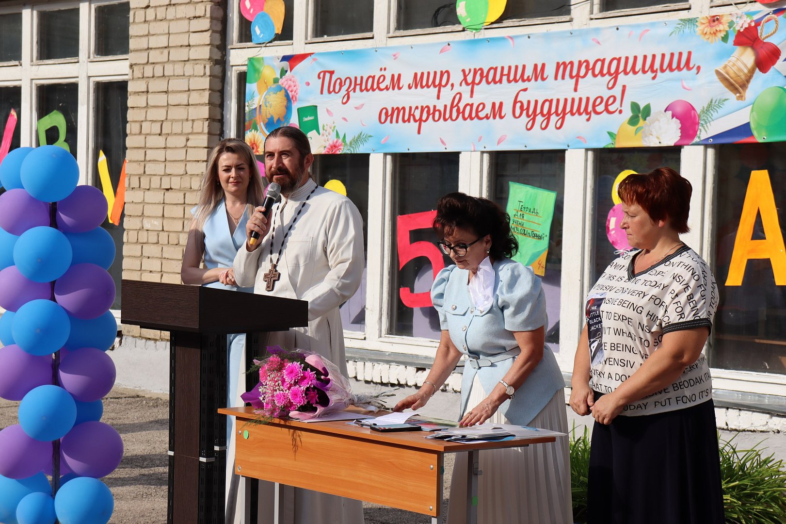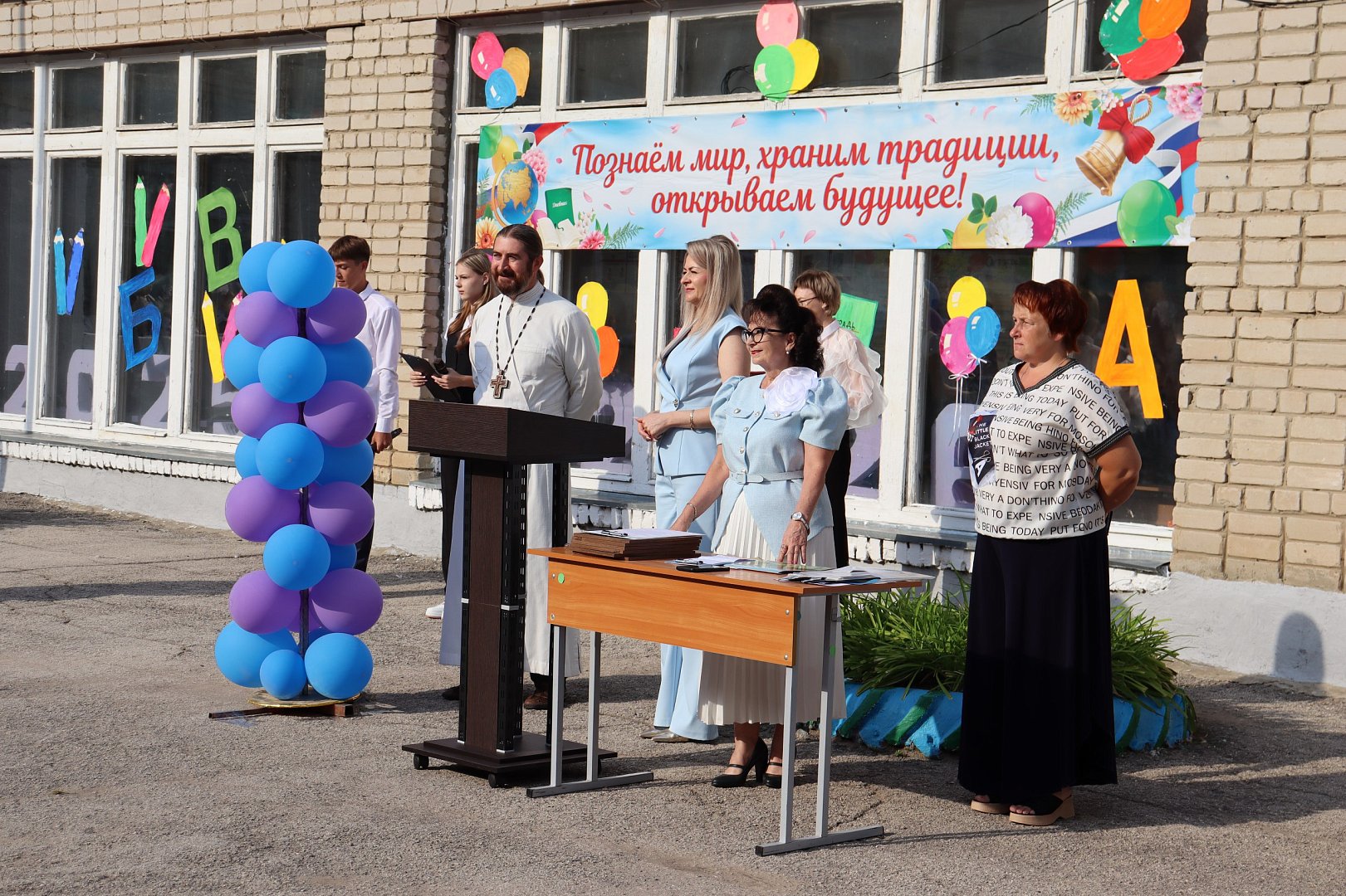 Радость встреч с учителями, школьниками и их родителями разделили почетные гости - руководитель аппарата администрации Краснопартизанского муниципального района Н. В. Безгубова и настоятель храма п. Горный отец Александр.
