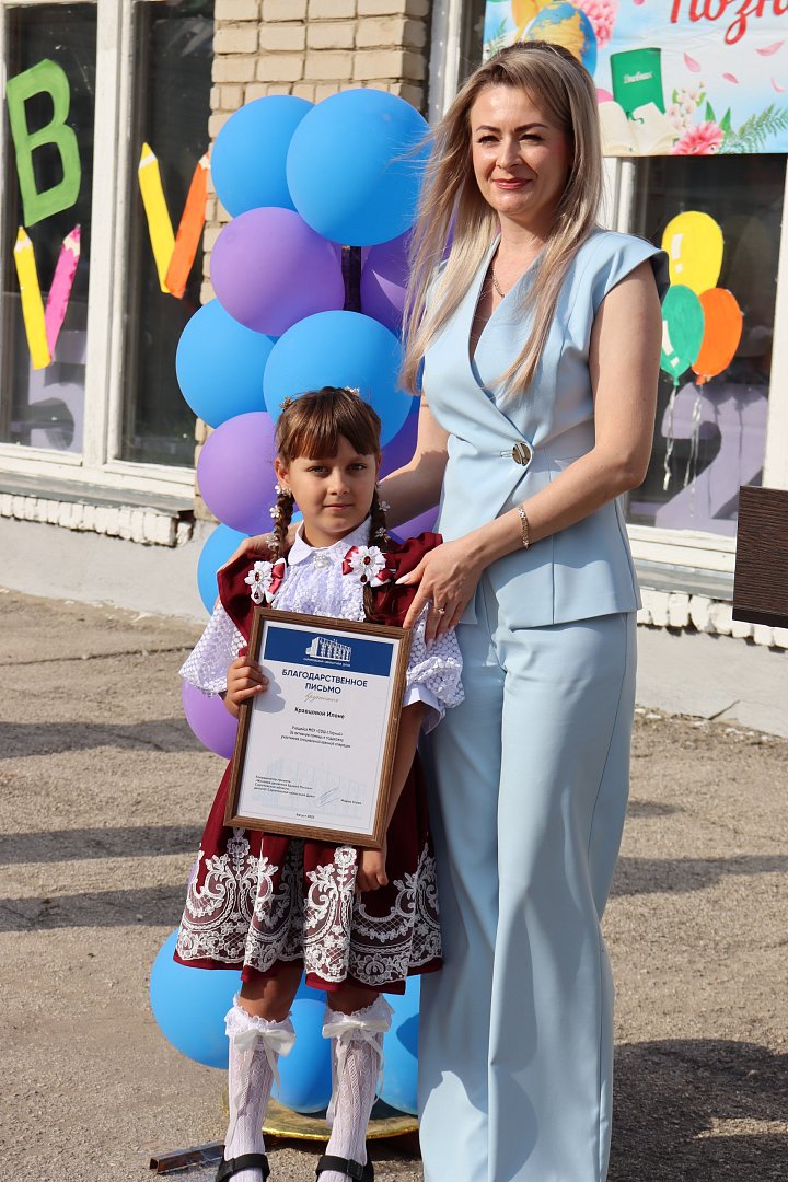 Много трогательных моментов было подготовлено специально к этому дню. Это и красивые музыкальные композиции, подготовленные совместными усилиями учителей и школьников, и первое выступление первоклашек, и символическое вручение им Книги Знаний, проведение акции «Самолетик будущего» с напутственными, выход на импровизированную сцену Шапокляк, так развеселившей всех участников мероприятия и, конечно же, звонкое звучание первого звонка, пронесенного по школьному двору учеником 11 класса Кузьминым Вячеславом и ученицей 1 класса Машей Сиряк.