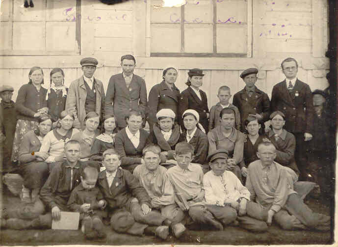 На фото 1941 г.: ученики и учителя Больше-Сакмыковской неполной средней школы. А. Улюшкина 2-я слева во 2-ом ряду.