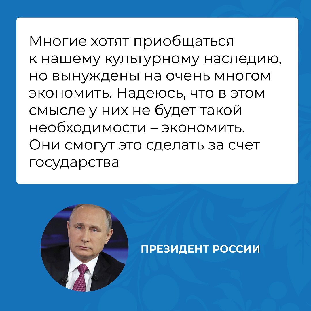 Президент России Владимир Путин рассказал, что с правительством страны уже несколько месяцев обсуждается введение так называемой "Пушкинской карты". Предполагается, что она будет выдаваться молодым людям от 14 до 22 лет.