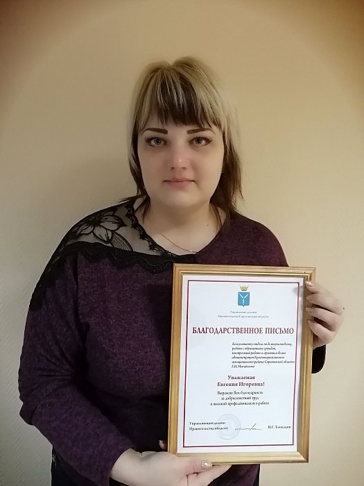 19 января 2021 года Благодарственное письмо управления делами Правительства Саратовской области за добросовестный труд и высокий профессионализм в работе вручено консультанту отдела по делопроизводству, работе с обращениями граждан, контрольной работе и архивным делам администрации Краснопартизанского муниципального района Е. И. Михайленко. Благодарственное письмо Евгении Игоревне вручил глава Краснопартизанского муниципального района Юрий Леонидович Бодров. -