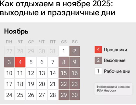 Отдыхать же будем три дня подряд — воскресенье (2 ноября), понедельник (3 ноября) и вторник (4 ноября). Соответственно, на неделе с 3 по 9 ноября работать придется всего три дня.