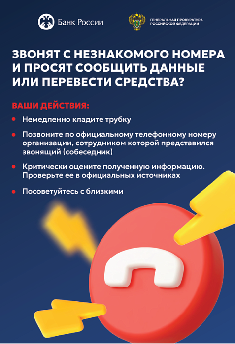 Никогда не сообщайте личные данные, пароли и реквизиты банковских карт по телефону! Если вам предлагают перевести ваши деньги “на безопасный счёт” - прекращайте разговор немедленно! На вашем счёту ваши деньги уже в безопасности!