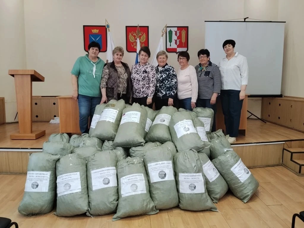 Дружная команда паучков Союза женщин, группы помощи СВО Краснопартизанская семья и Добросклада подготовила к отправке масксети.