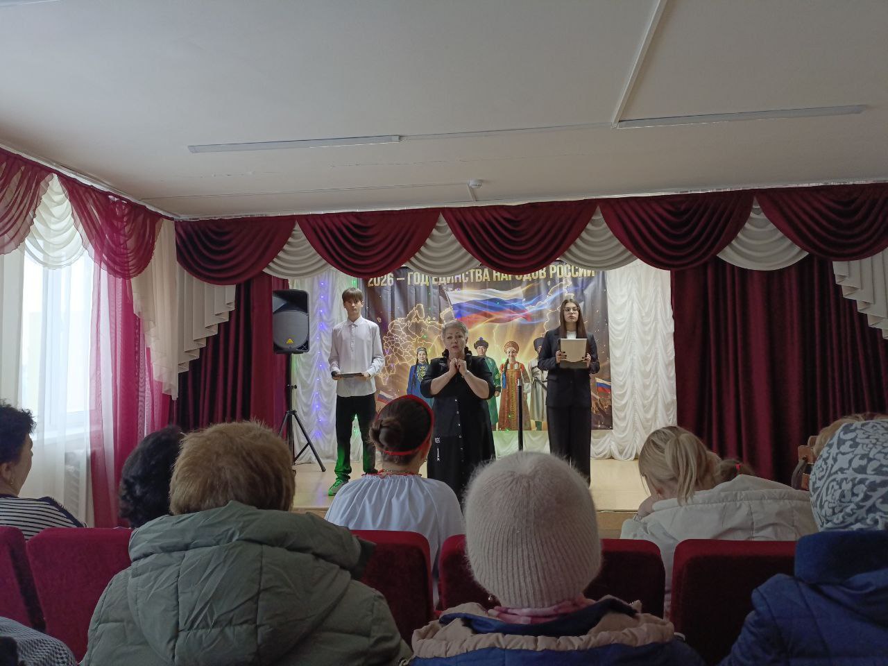 С приветственным словом выступила начальник культуры и кино Краснопартизанского муниципального района Н. С. Зажигина, которая поприветствовала собравшихся и отметила, что 2026 год будет посвящен богатейшему культурному наследию, дружбе народов нашей страны, которые составляют одну большую семью.