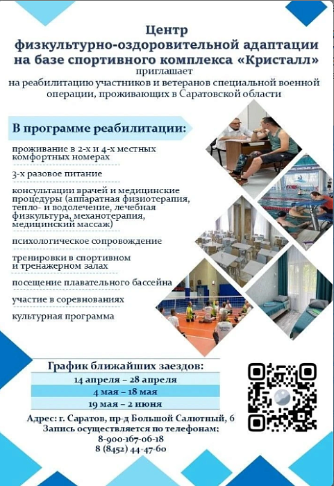 Центр физкультурно-оздоровительной адаптации государственного бюджетного учреждения Саратовской области «Спортивный комплекс «Кристалл» приглашает участников и ветеранов специальной военной операции на реабилитацию