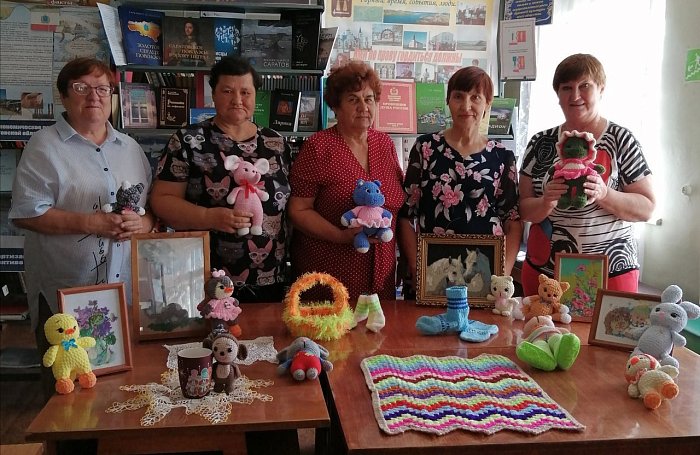 На выставке было представлено много работ: это яркие мягкие игрушки, ажурные салфетки, вязанные детские носочки, связанный талантливыми руками коврик. Удивляют картины, созданные участницами клуба.