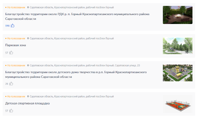 - Благоустройство территории около РДК р. п. Горный Краснопартизанского муниципального района Саратовской области – за этот объект проголосовали на данный момент 198 человек;