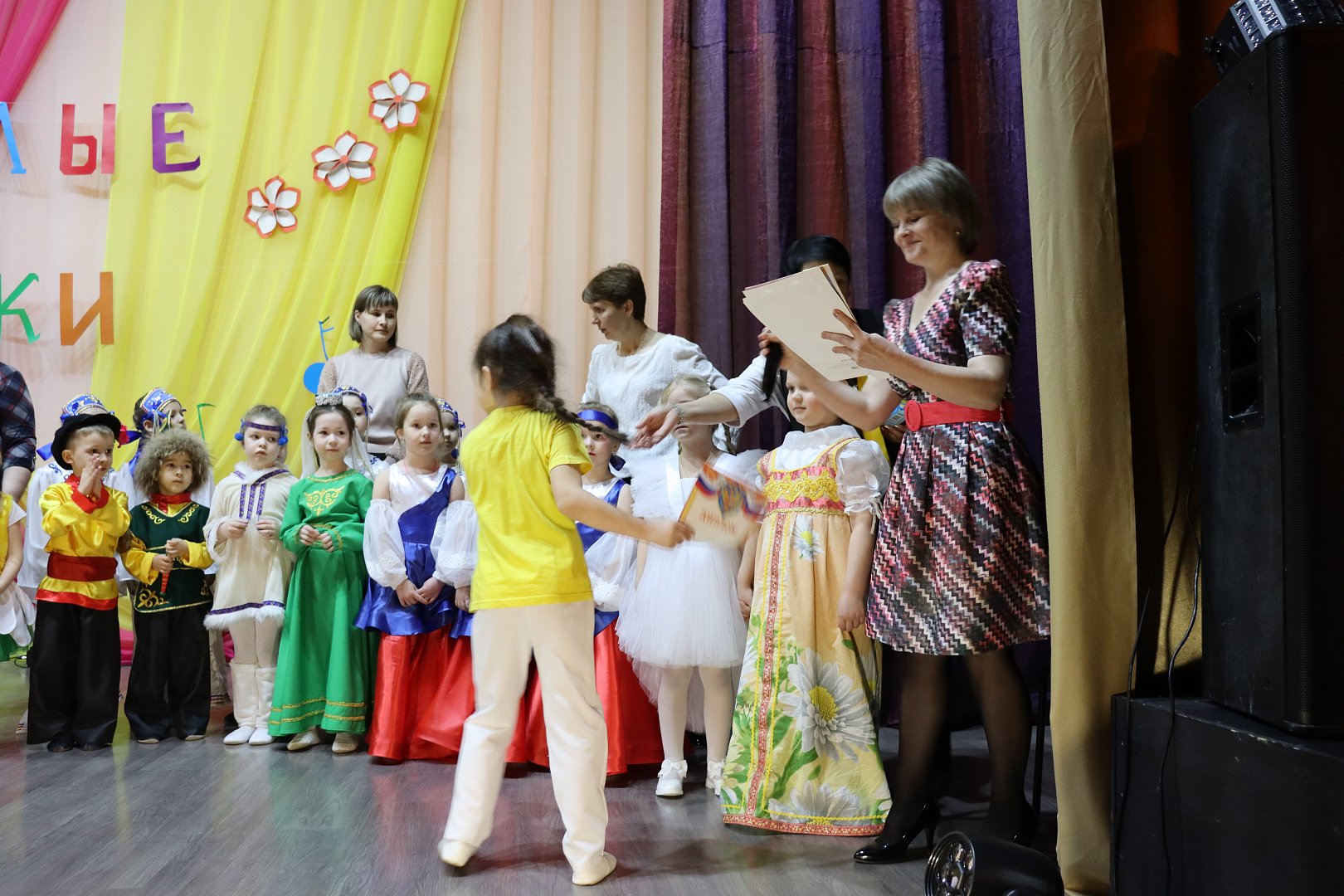 Под аплодисменты зала на сцену вышла заведующий детского сада «Родничок» Г. С. Исимбаева, которая поприветствовала гостей мероприятия и подчеркнула, что текущий год – Год единства народов России и Год дошкольного образования. Два масштабных события, тесно переплетаясь, слились в один прекрасный праздник – фестиваль детских талантов.