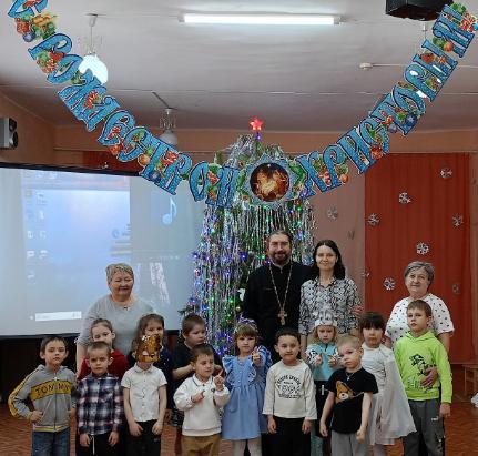 Мероприятие прошло в очень теплой атмосфере и с участием отца Александра и матушки Татьяны. Ребята познакомились с историей праздника, посмотрели мультфильм о рождении Иисуса Христа.